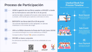Nuestro objetivo coordinando la ¨feria de libros usados¨es que las familias puedan adquirir los libros escolares usados en cursos anteriores a precios más bajos, alargando el ciclo de vida de los mismos, lo que repercute positivamente en el medio ambiente, además de fortalecer los vínculos de la comunidad escolar.